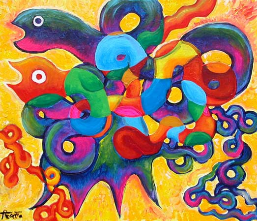水彩で抽象的な絵を描いてからペンを入れる方法を始める。