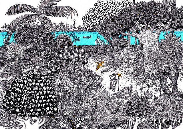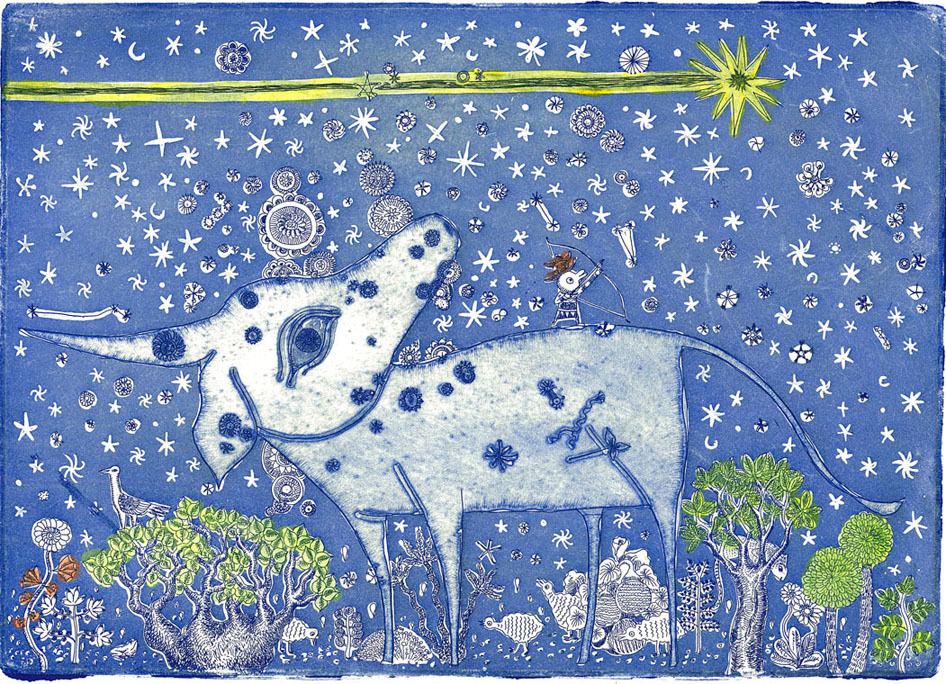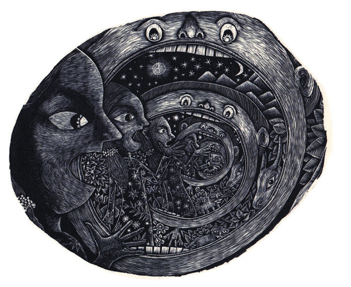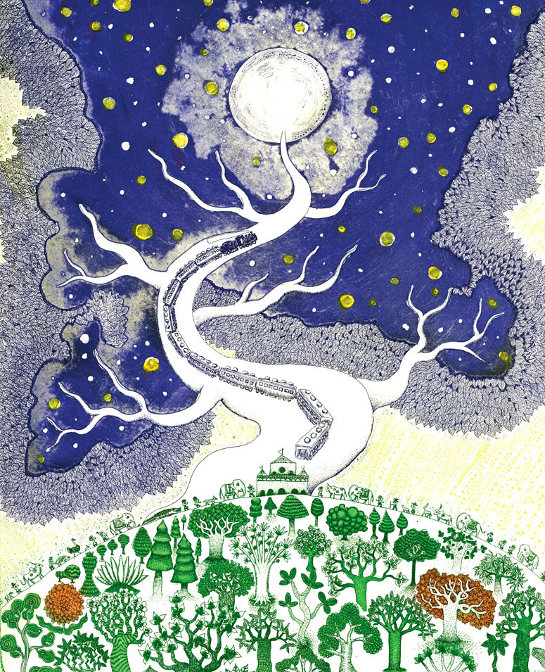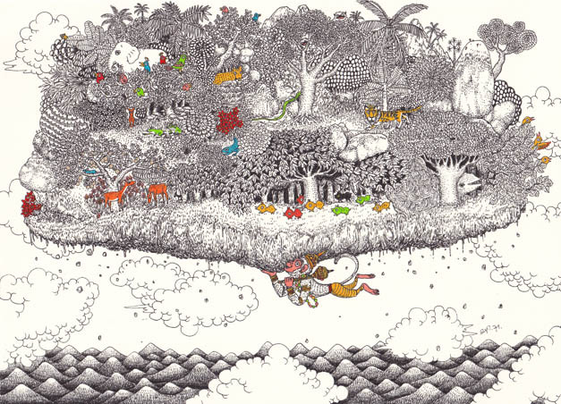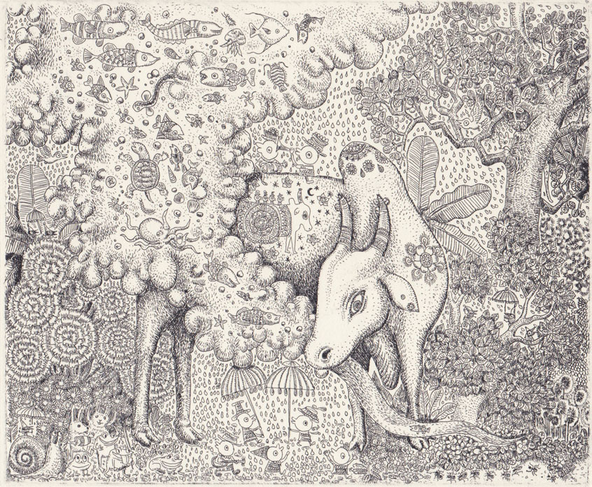 銅版画をメインに。ボールペンを丸ペンに持ち替え、さらに細密に、カラフルになる。