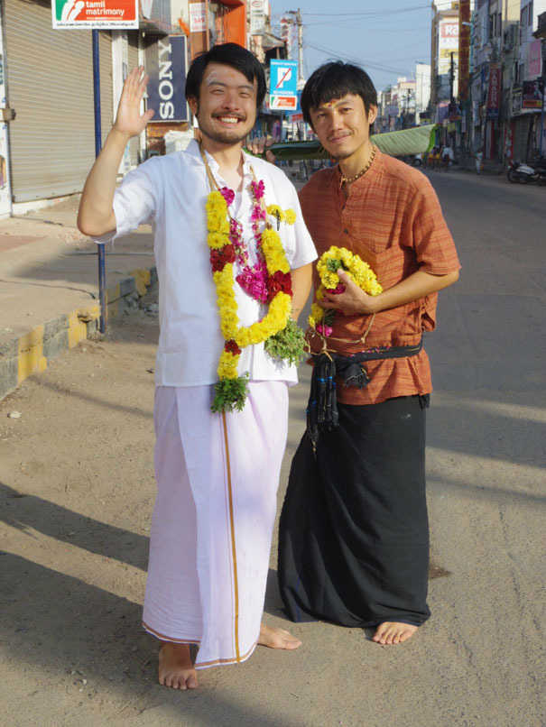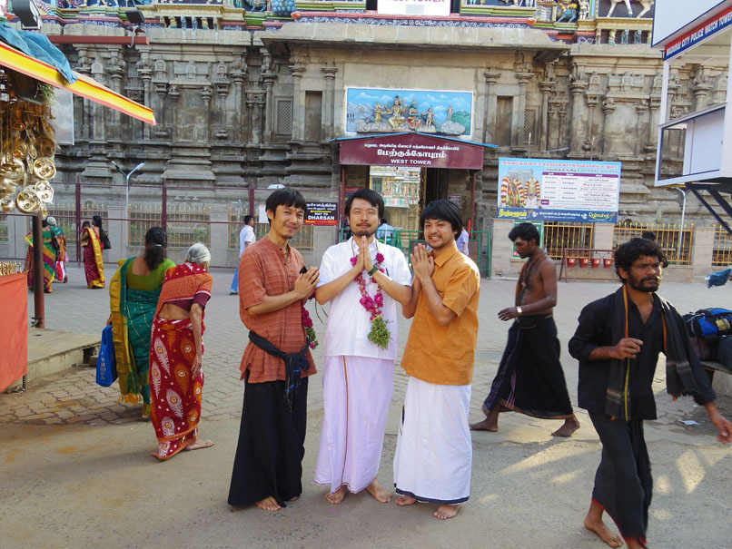 昨日買ったドーティとチャッタ(シャツ)を着てサーミにならって裸足でミーナークシーへ向かって歩く。マサラワーラー2人も即席サーミ。
