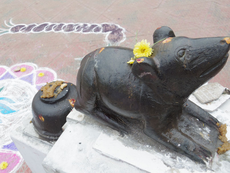 ガネーシャの乗り物のネズミにもポンガルがお供えされている。