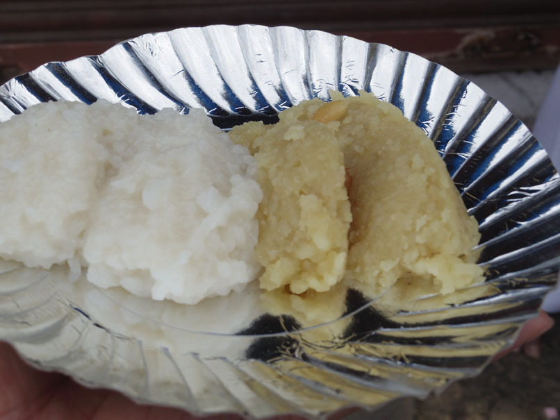 お寺のプラサーダム屋さんでチャッカライポンガル(甘いポンガル)を買って食べる。今日はタイ・ポンガルの日。まずは2ポンガル!!