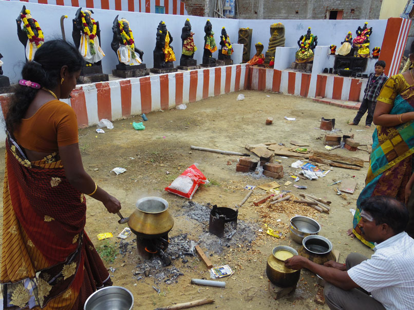 が、このすぐ近くでコーラムの上にかまどがあり、その上につぼ形のナベを乗せてポンガル作っていた!