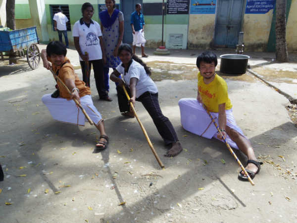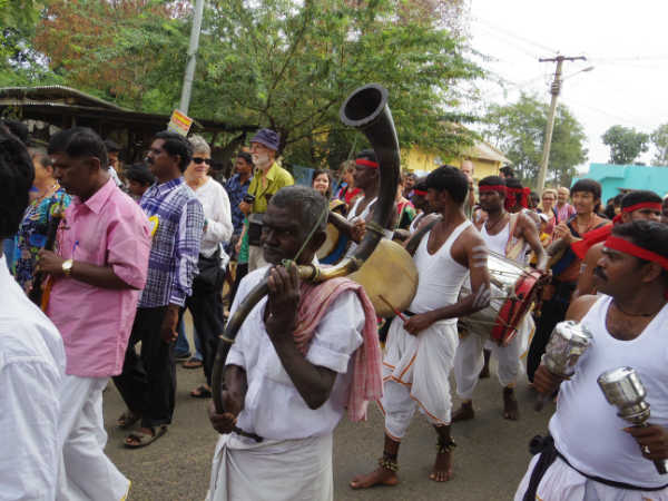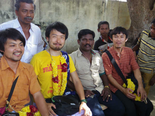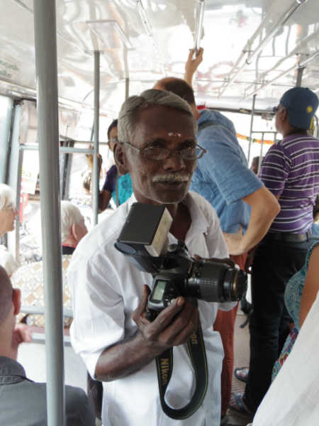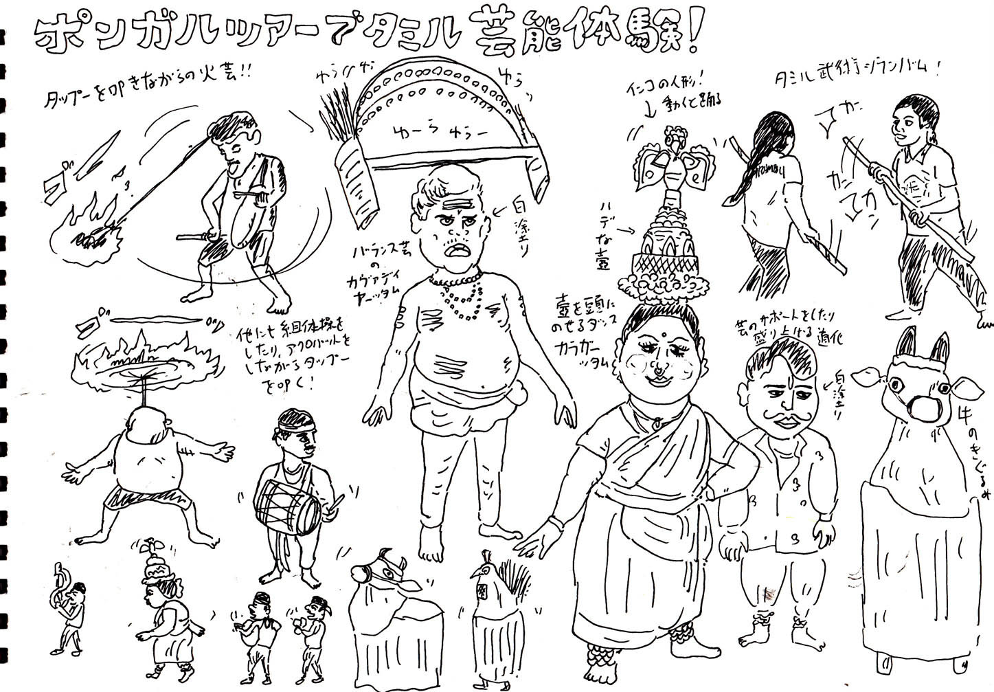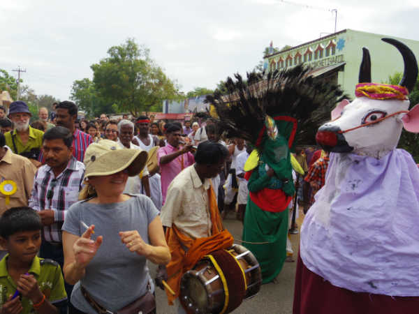 今日はこの外国人満載のバスでアランガナルール近くの村で色々な芸能を体験する無料ツアー。