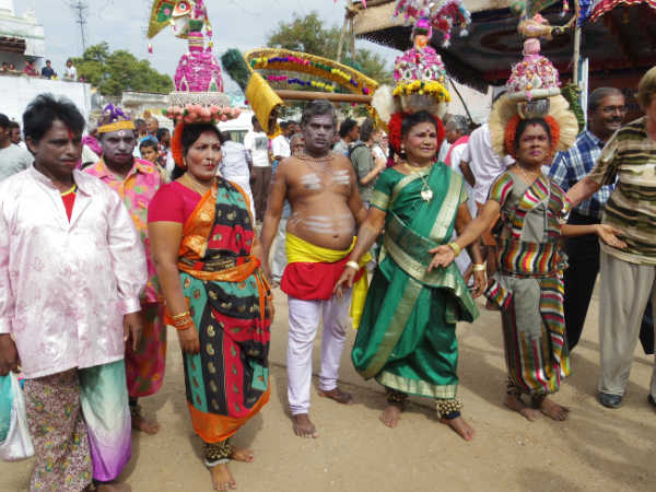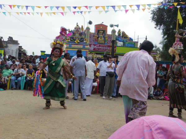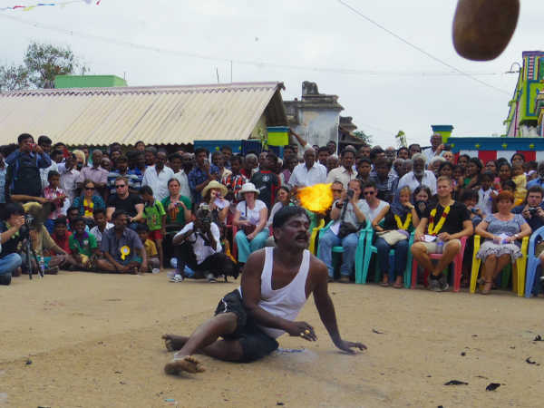 カラガーッタムのおばちゃんも負けずに、「目隠しして刀を振り回し、道化の口にくわえさせたバナナを切る」「道化をまな板にしてバナナを切る」などの過激なパフォーマンスで応える。