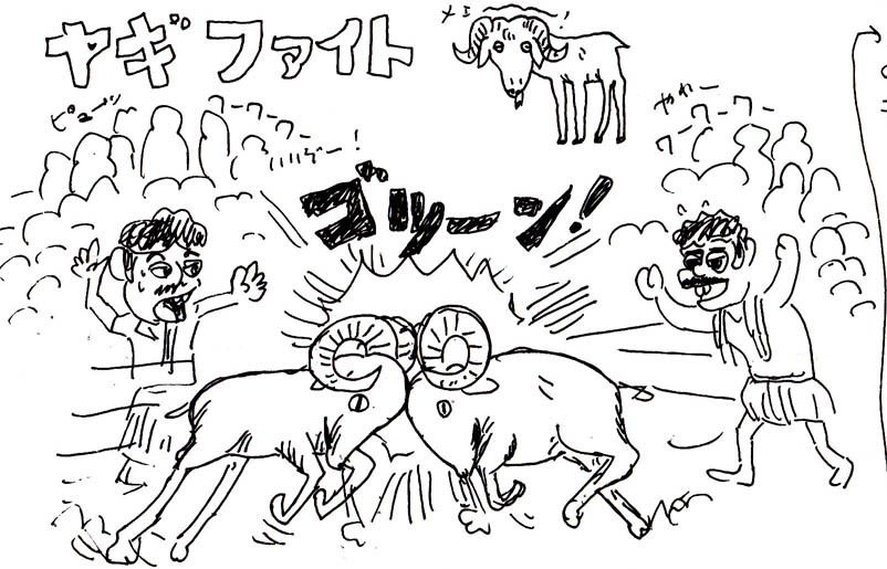 広場での演芸大会のあとは「ヤギのファイトだ!」と言われて、みんなで次の会場に歩いていく。