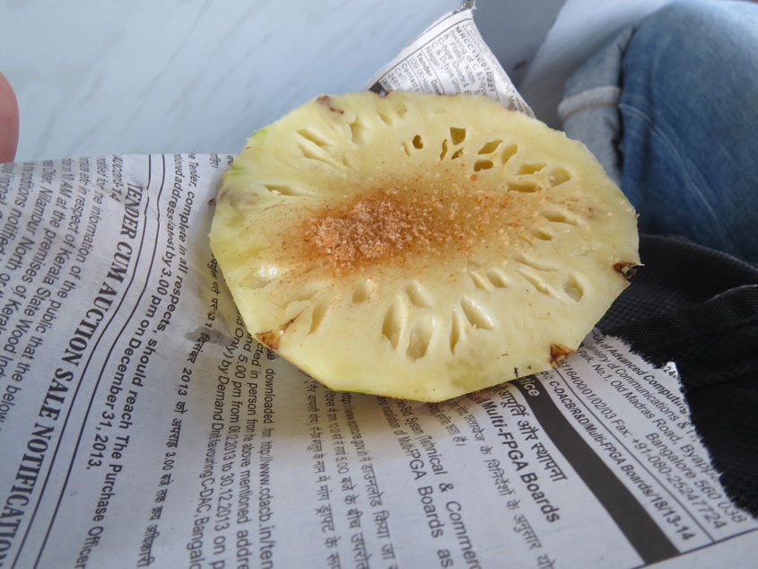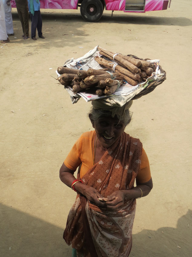 バスは田舎道を猛スピードでガタガタ走りプドゥコーッタイという町で休憩。物売りのおばあちゃんが「ガラケ〜〜〜〜〜〜イッ ガラケ〜〜〜〜〜〜〜〜イッ」と言って20cmくらいのとんがったつぼみのようなものを売っていたので、買ってみた。