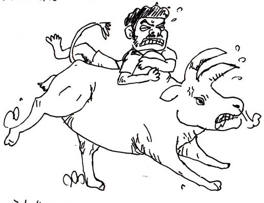 入り口から勢いよく飛び出してくる牛の背中のコブに抱きつき、しばらく耐えれば選手の勝ち、牛が振り切って逃げ切れば牛の勝ち。牛の飼い主が景品をもらう。