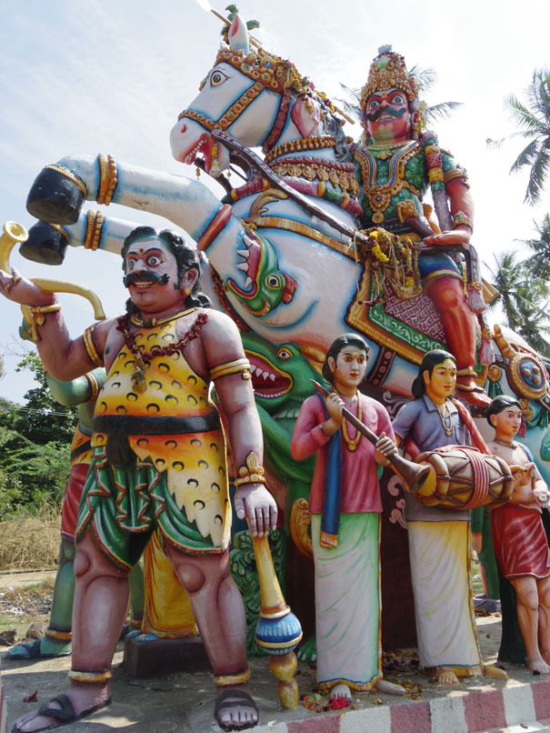 でっかい白馬に乗ったギョロ目のカラフルな神様はムニヤーンディという神様で、シヴァと同じと言っていた。