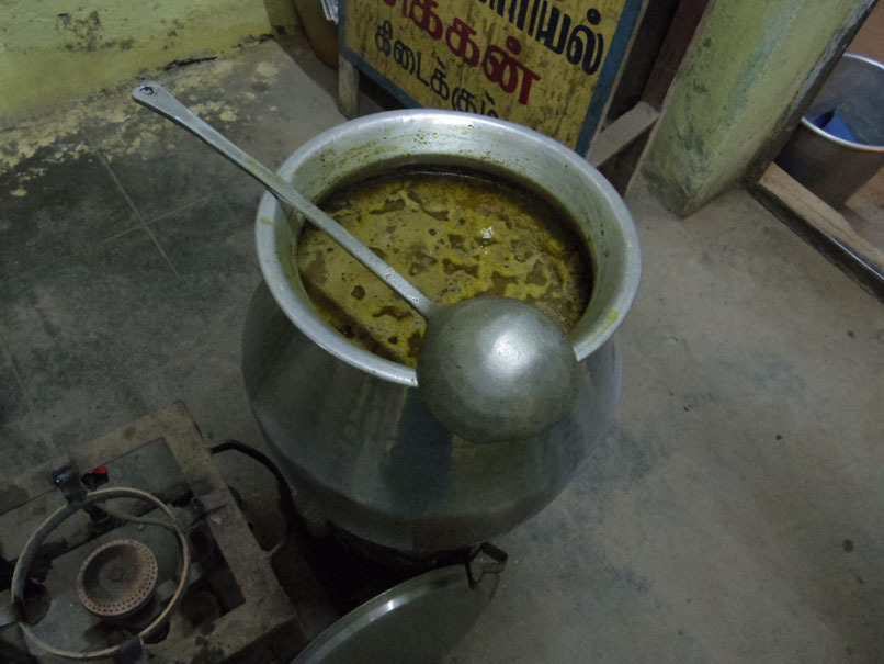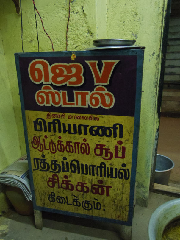 看板を見ると、「JVストア ビリヤーニ、アーットゥッカールスープ(マトンスープ)、ラッチャンポリヤル(血のポリヤル)、チキン 有ります」と書いてある。